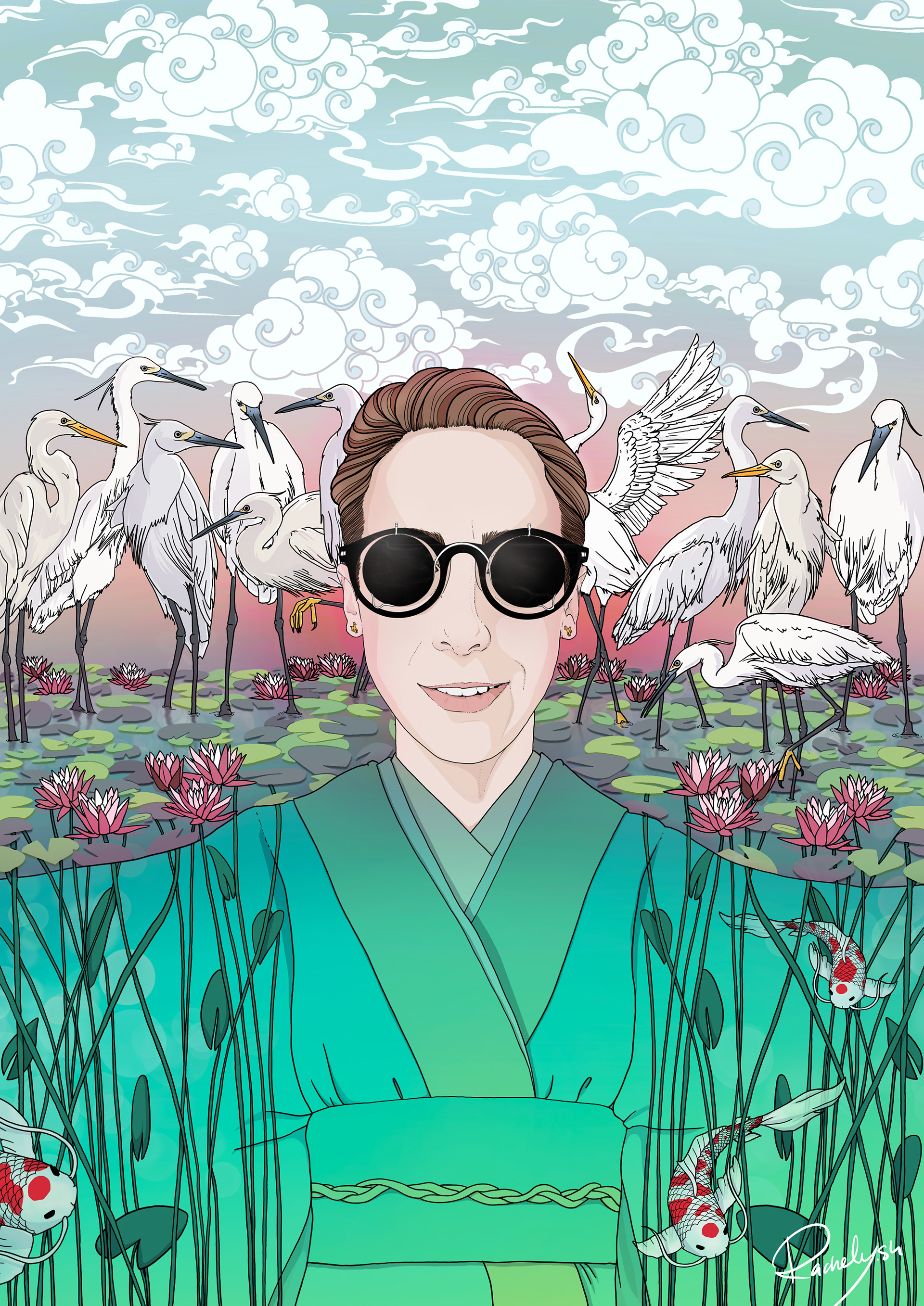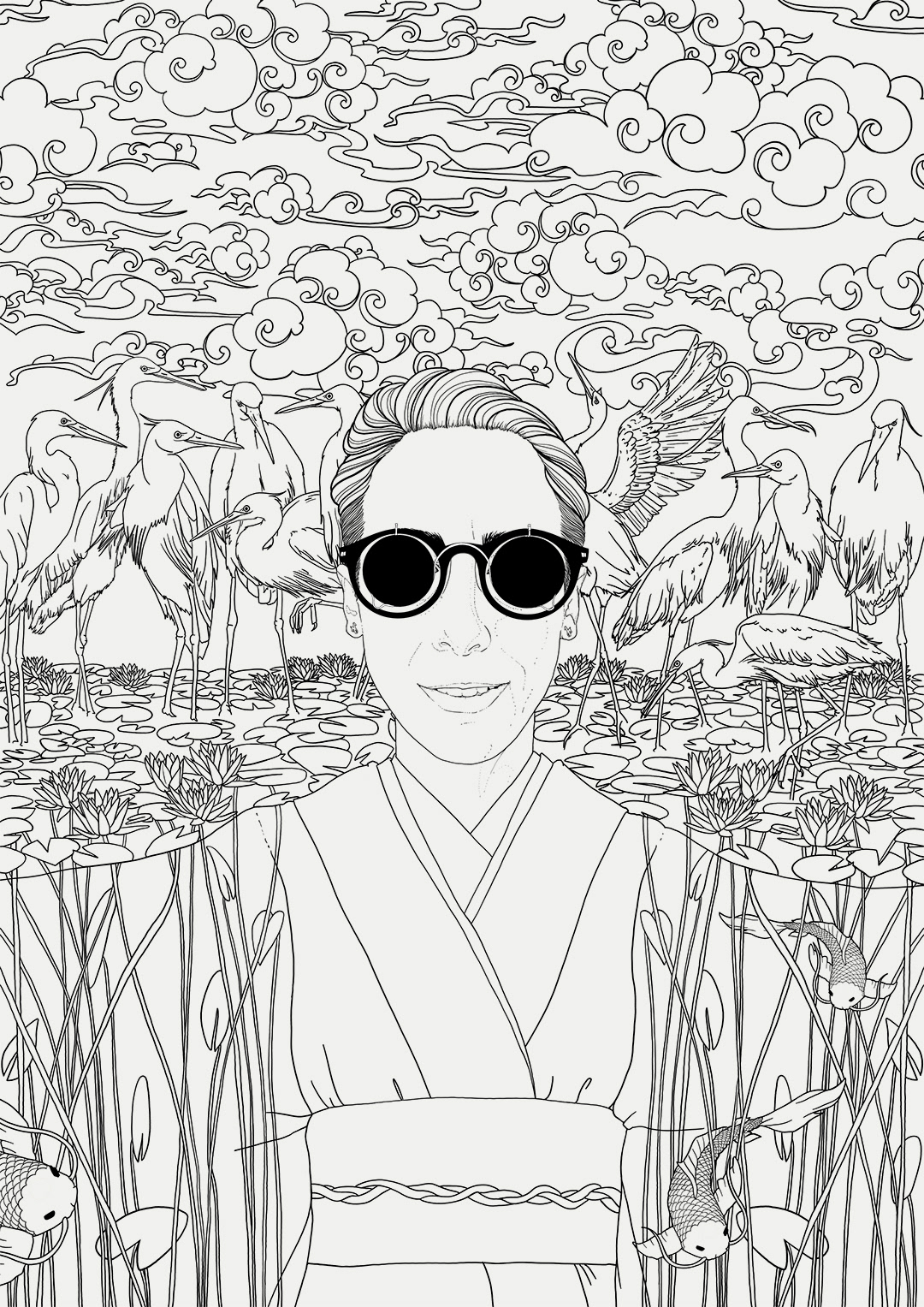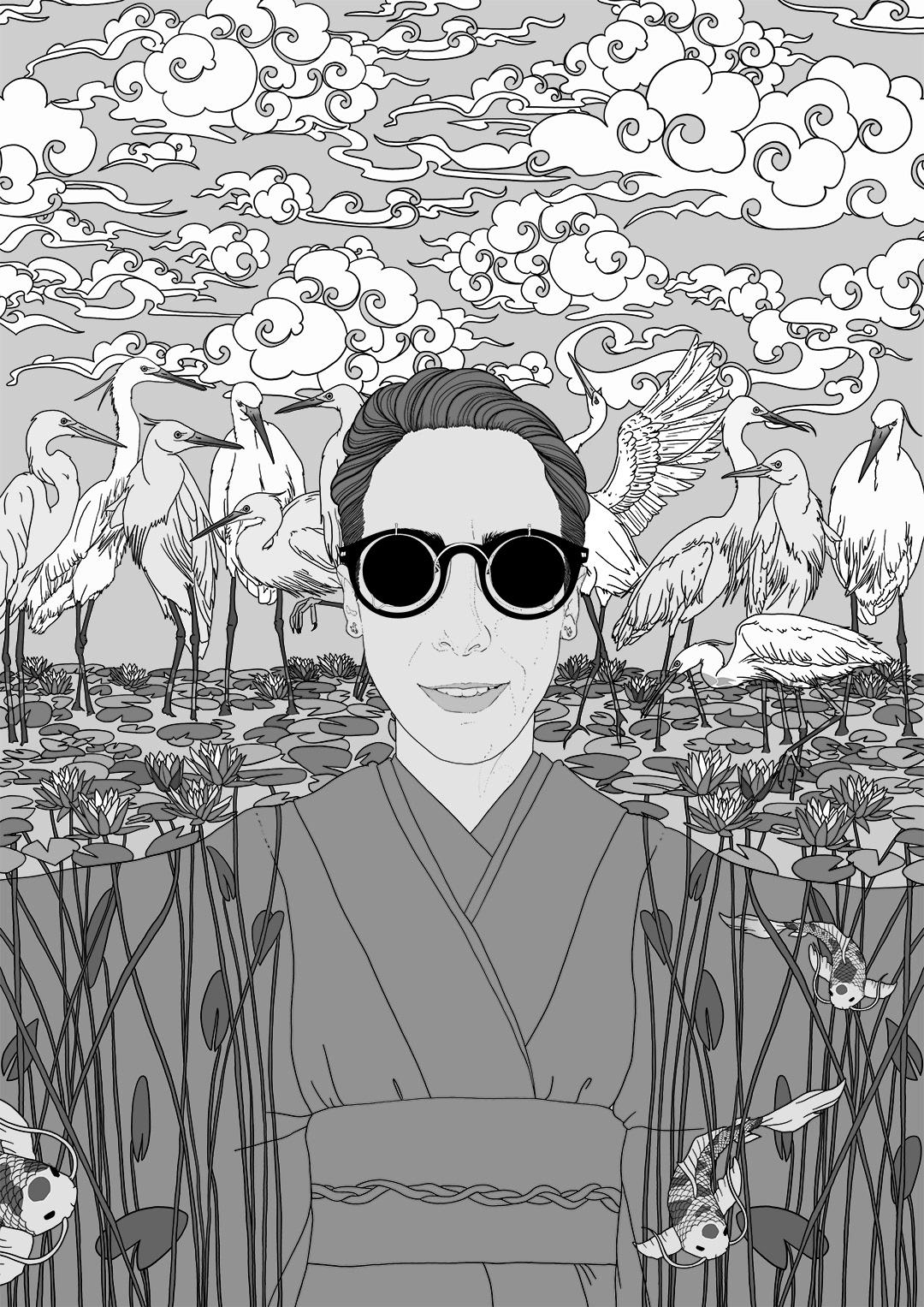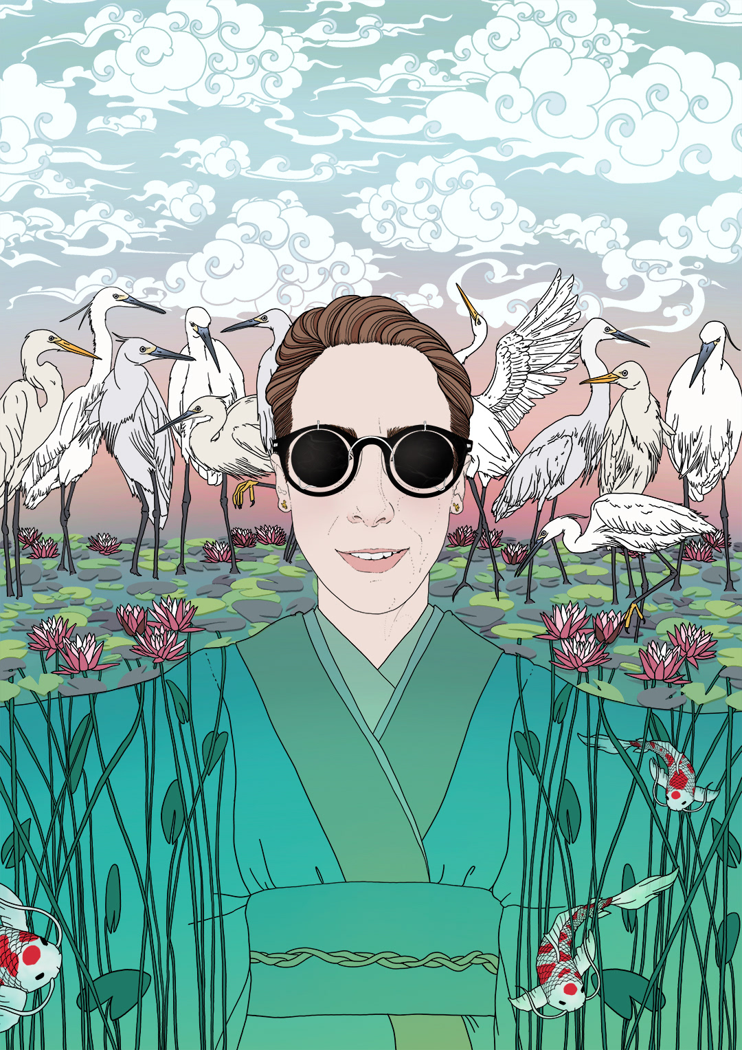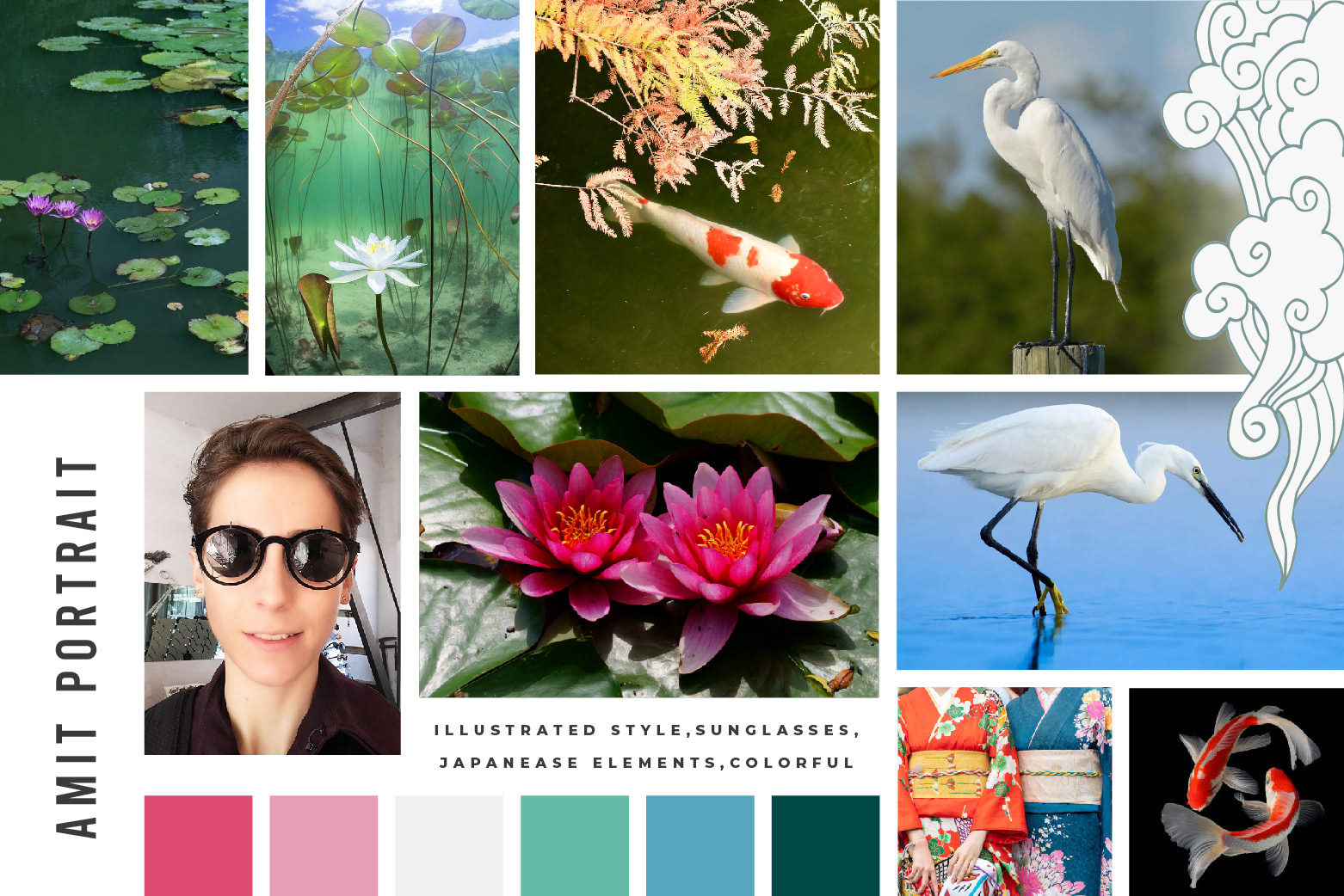 Self portrait - A custom project for a private client. Notes: loves Japanese motifs/elements, colorful, illustrated style, should empower and celebrate life and the world around us.