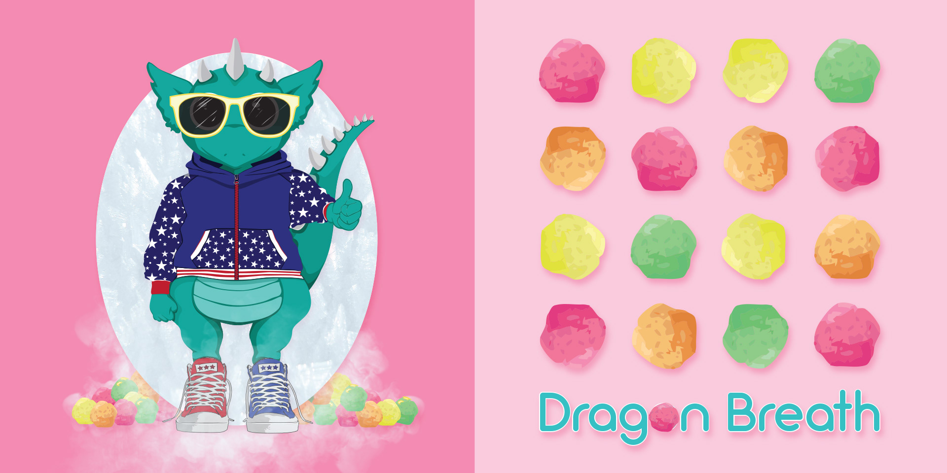 Brand identity and illustration for Dragon Breath - a U.S brand for frozen and colorful dessert with visual effect of dragon breathing. Eating these candies is a unique and fun experience and we wanted to capture it into our logo and make it desirable, colorful and tempting.