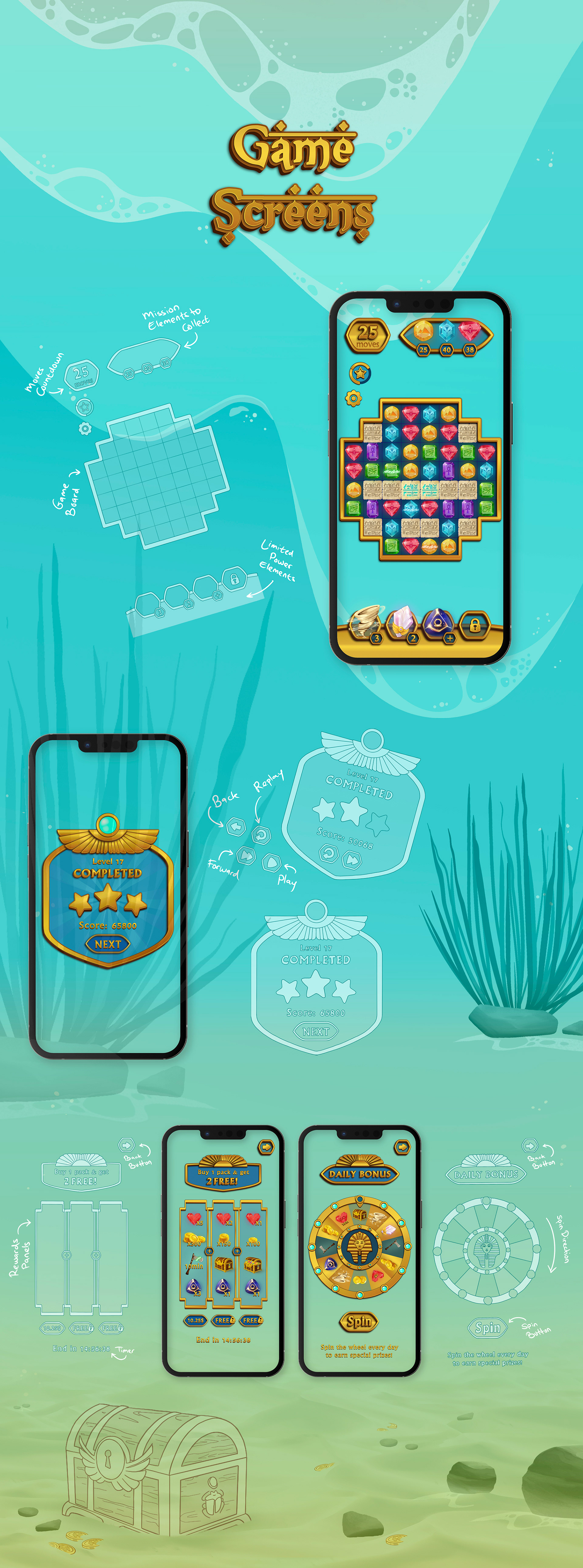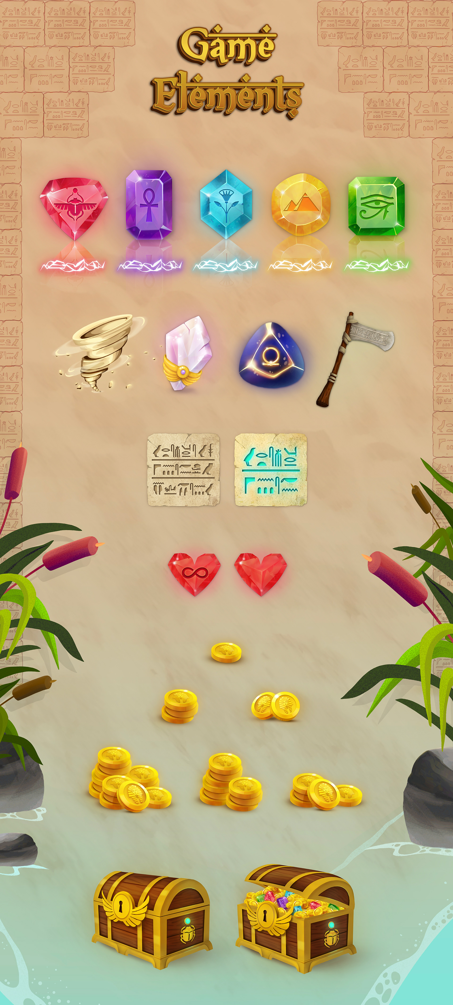 A challenging and super fun self project of creating a full art process for a match-3 game. From concept to final illustrations and rendering for game elements, icons, user interface, game screens, backgrounds, logo and final presentation.